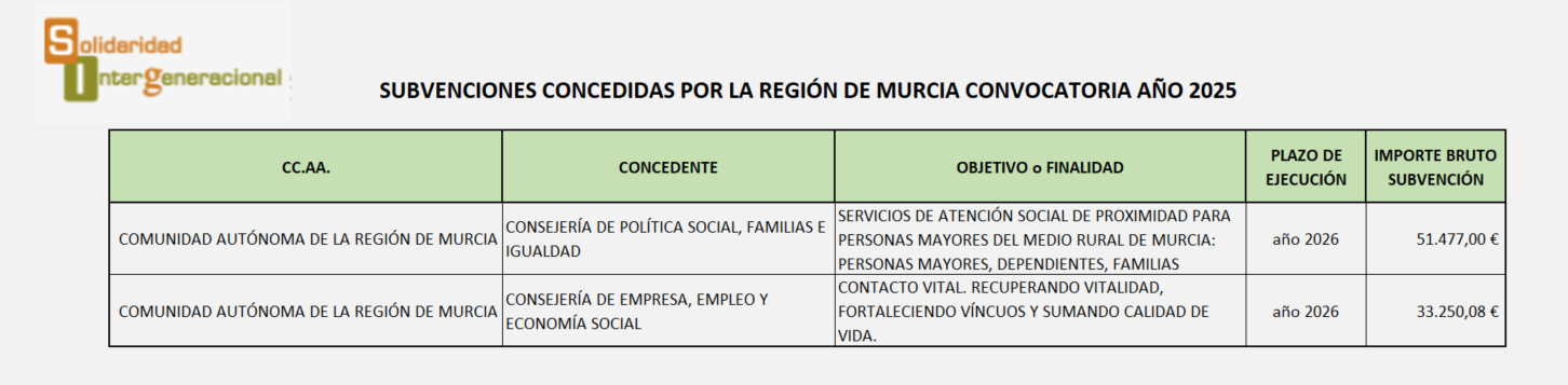 Solidaridad Intergeneracional, asociación estatal sin ánimo de lucro, cuenta con una sólida trayectoria de presencia en la Comunidad Autónoma de la Región de Murcia.